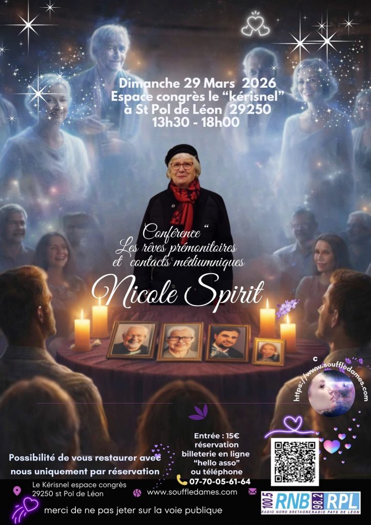 Nous avons le plaisir d’annoncer une conférence dimanche 29 mars 2026, au centre de congrès « Le Kerisnel » à St Pol de Léon. Il s’agira d’un après-midi, ouverture des portes à 13h30, animé par Nicole médium spirit, conférencière et médium.